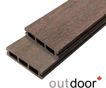 Террасная доска из ДПК темно-коричневого цвета производства Канады. Продольные бороздки на древесно-стружечном композите не дают избыточной влаге проникнуть вглубь террасы. Кроме того, за счет такой «ребристости» доска остается безопасной в сезон дождей и зимой, когда террасу покрывает тонкая ледяная корка.